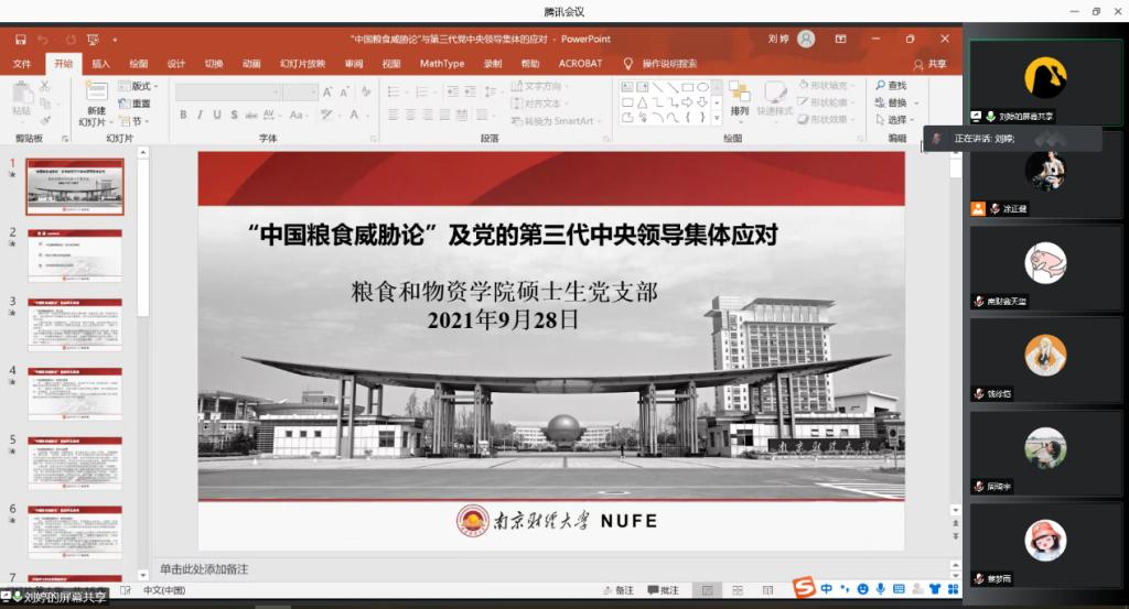 2021年9月28日晚,yl23411永利集团官网硕士研究生支部书记刘婷以“‘中国粮食威胁论’与党的第三代中央领导集体应对”为主题,给全体支部党员上了一堂生动的党课。