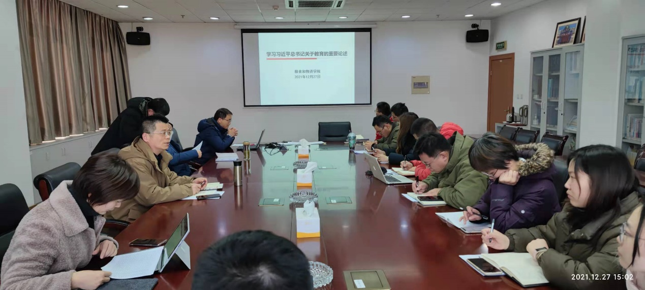 学院党总支书记张圣兵同志对杨老师的分享进行总结,认为当代教师,应认识到教育的重要性和教师的使命感;具有基础目标和更高要求;应有宽广的胸怀和高尚的人格;应跟上时代的步伐,不断探索前进。随后,总结梳理了《习近平总书记教育重要论述讲义》的主要内容,并联系学院实际,结合本院特色,对本院教职工的实际工作进行指导。他还补充提到全面从严治党的相关内容,认为学院教师应严格要求自己,学院领导班子也应充分发挥全面从严治党的政治引领和政治保障作用。