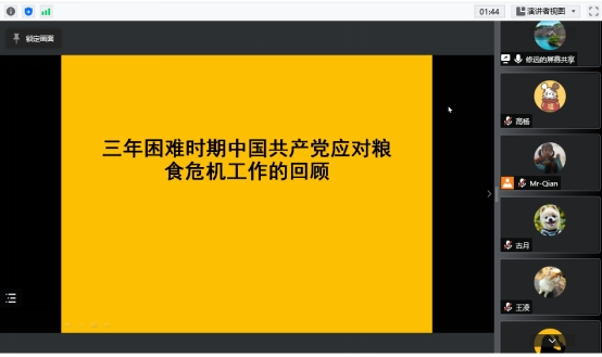 郭老师首先简要介绍了三年困难时期的粮食形势,并总结了粮食危机产生的主要原因。危难之际,中国共产党深入调研粮食危机,召开一系列会议研究解决粮食问题。此后,党针对粮食危机展开了全面应对行动,如增加农业投入比重,精简城镇人口,提高农业人力投入,以尽快恢复农业产能,调整农村发展政策,提高农村发展综合水平,最终粮食危机基本得到解决。分享的最后,郭晓东老师总结了应对粮食危机的教训,主要表现在信息沟通机制不畅以及民主决策机制的不健全,并进一步总结了应对粮食危机的经验。