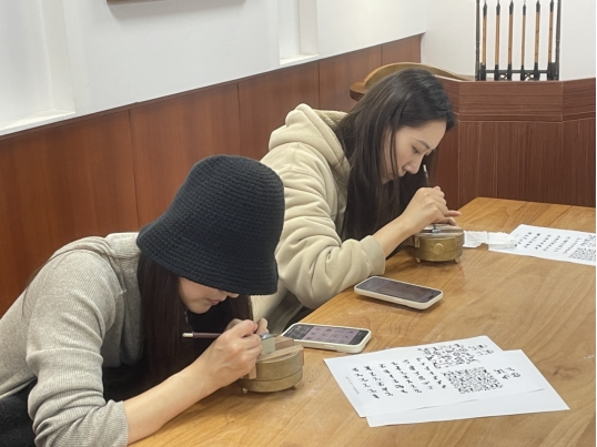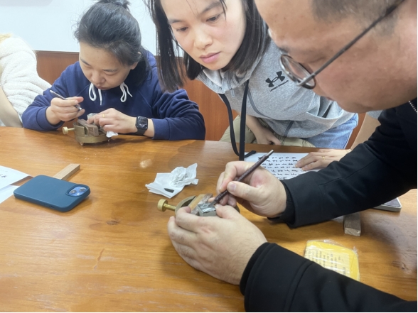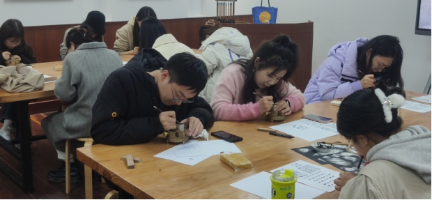 何教授从杭州亚运会上的象形文字动画入手,向大家介绍了印章的发展历史、功能等趣味知识。通过现场示范,何教授向大家讲解了磨石、执刀、刻制等篆刻技巧。印床转动,刻刀在方寸之间穿梭,在何教授的耐心指导下,同学们尽情体验篆刻之美、创作之乐。安静的篆刻现场,只剩下石料和刻刀轻轻碰撞的声音。最后,何教授还一一点评了同学们的作品,现场欢声笑语不断。