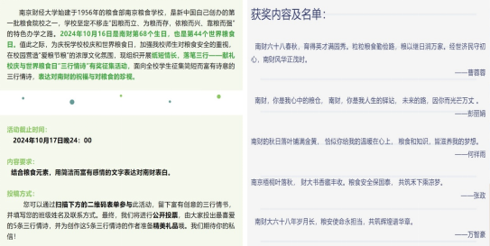 活动期间,yl23411永利集团官网通过公众号等新媒体面向全校征集爱粮节粮三行情诗,最终选定5首情诗于公众号推送,表达对母校68岁生日的祝福,有效营造了“爱粮节粮”的文化氛围。