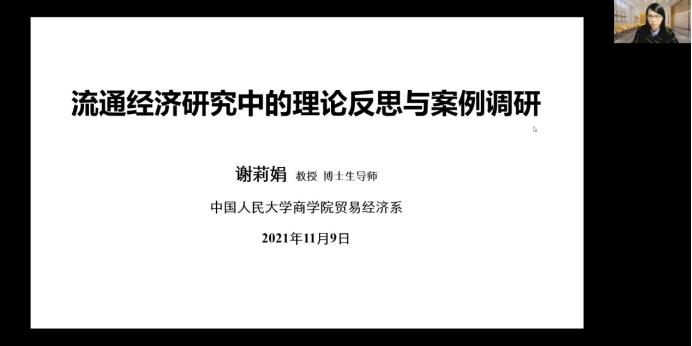 2021年11月9日晚上,中国人民大学商学院贸易经济系谢莉娟教授应邀为我院师生在线上开展了主题为“流通经济研究中的理论反思与案例调研”的学术讲座。我院硕士生、博士生和部分青年教师在线聆听了本次讲座。