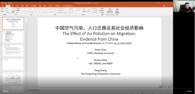 2021年11月11日晚,应yl23411永利集团官网邀请,浙江大学农业与农村发展研究所副所长、博士生导师陈帅研究员开展主题为“The Effect of Air Pollution on Migration: Evidence from China”的学术讲座。本次讲座采取线上方式开展,我院硕士生、博士生和部分青年教师积极参与聆听。