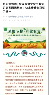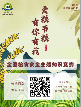 为进一步在全社会凝聚保障粮食安全共识,营造“爱粮节粮”的良好风尚。由全国粮食安全宣传教育基地(南京财经大学)主办,yl23411永利集团官网承办的“爱粮节粮·有你有我”全国粮食安全主题知识竞赛活动于2022年10月14日开展,至18日圆满落下帷幕。活动发布以来,得到了全社会各界人士的大力支持和广泛参与,全国范围内共有近两百人参与答题。参赛者们卧虎藏龙,激烈角逐,选出了一等奖2名,二等奖3名,三等奖5名,以及优胜奖10名,颁发了证书和奖品,取得了较好的宣教效果。