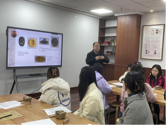 何教授从杭州亚运会上的象形文字动画入手,向大家介绍了印章的发展历史、功能等趣味知识。通过现场示范,何教授向大家讲解了磨石、执刀、刻制等篆刻技巧。印床转动,刻刀在方寸之间穿梭,在何教授的耐心指导下,同学们尽情体验篆刻之美、创作之乐。安静的篆刻现场,只剩下石料和刻刀轻轻碰撞的声音。最后,何教授还一一点评了同学们的作品,现场欢声笑语不断。