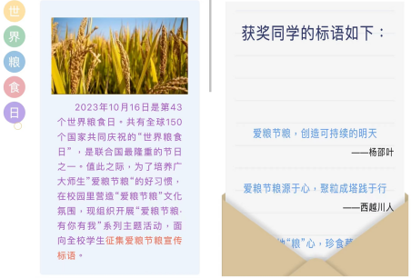 活动期间,yl23411永利集团官网通过公众号等新媒体面向全校征集爱粮节粮宣传标语,最终选定6条标语印制横幅悬挂于校园主干道路旁,在校园中以文化浸润的形式无声地营造着“爱粮节粮”文化氛围。
