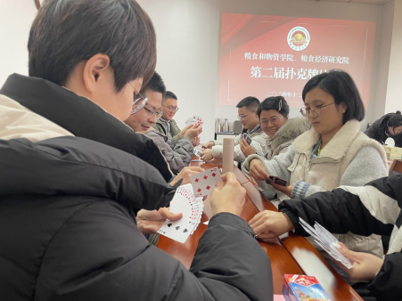 12月18日,为丰富教师的文娱生活,培养健康向上的爱好,增进教师之间的沟通交流,缓解工作压力,实现劳逸结合,增强团队凝聚力,展现粮物院蓬勃向上的精神风貌,我院举办了第二届扑克牌比赛