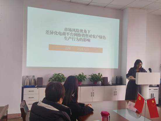 2024年12月5日上午,学院2024年第10期“青年教师学术沙龙”在仙林校区艺术楼402会议室顺利开展。高杨老师分享了题为“市场风险视角下差异化电商平台网络销售对农户绿色生产行为的影响”的研究成果汇报。